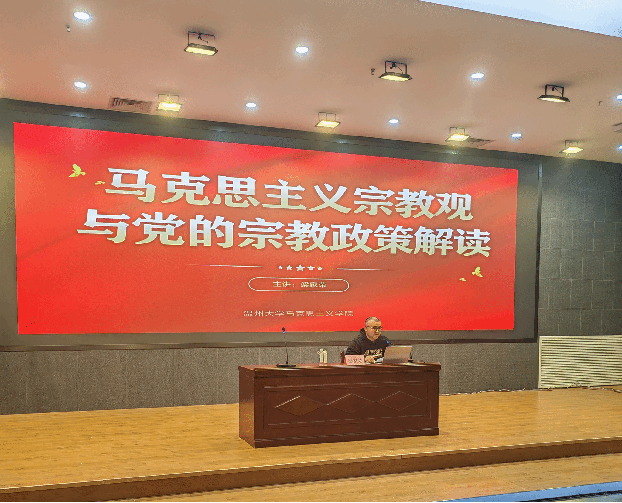 讲座以"马克思主义宗教观与党的宗教政策解读"为主题。梁家荣老师从马克思主义宗教观的哲学基础切入,系统阐释了马克思主义关于宗教本质、社会作用及其发展规律的科学论断。他结合《德意志意识形态》《资本论》等经典著作,深入浅出地解读了宗教产生的社会根源和认识论根源。