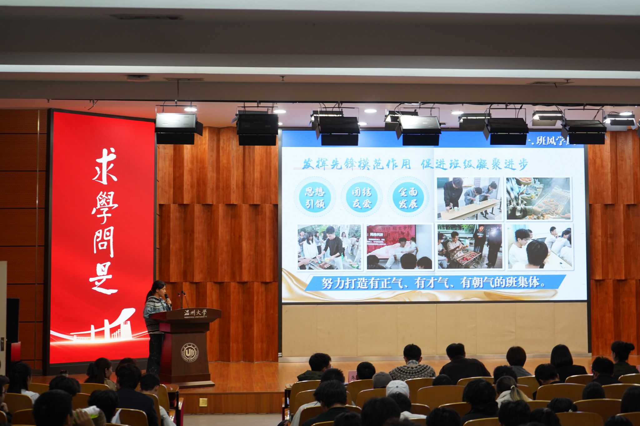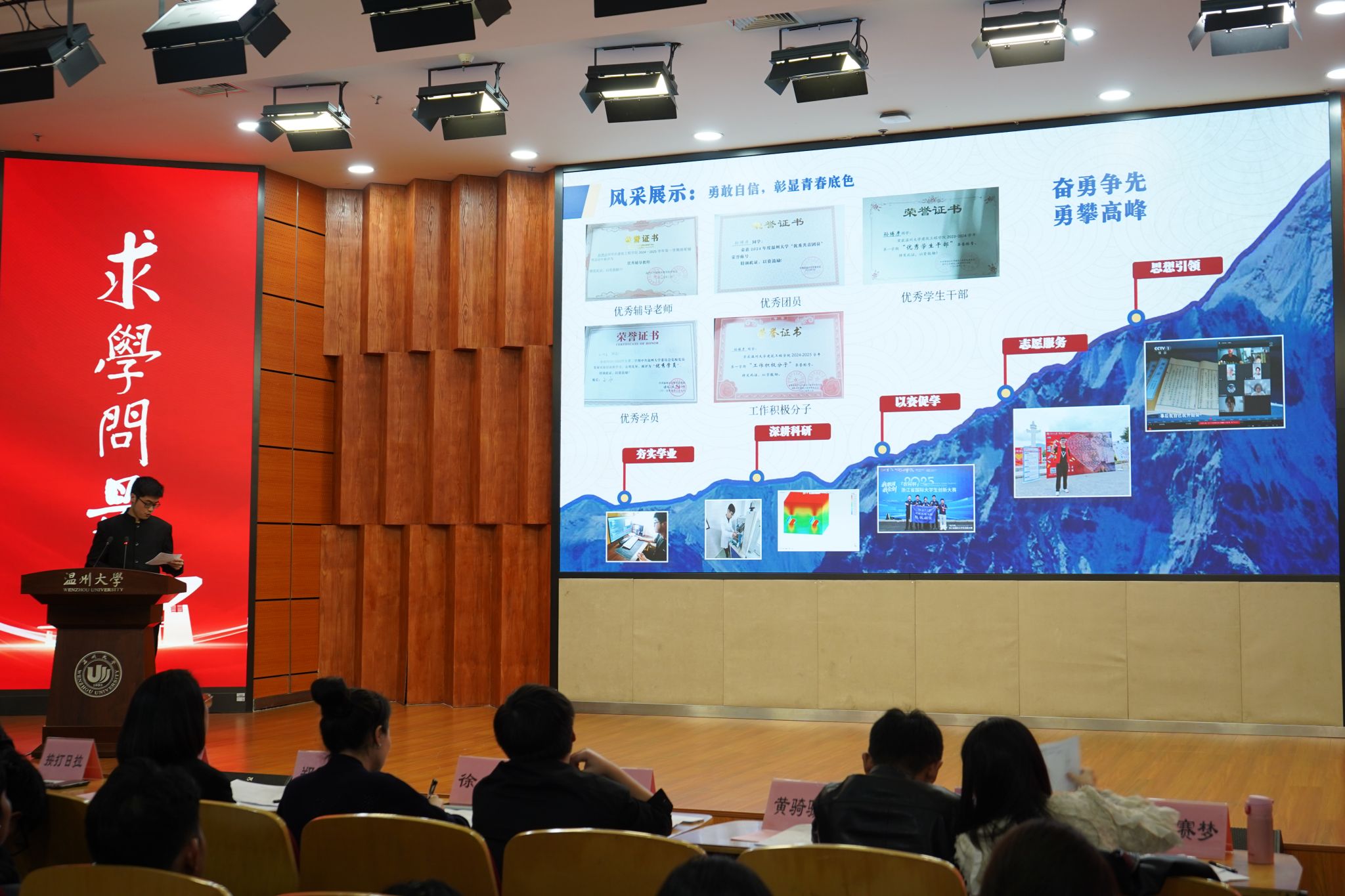 本次大会分为“优良学风班”与“学习标兵”两大评比环节。在主持人介绍出席嘉宾及评比规则后,评选正式拉开序幕。2023级与2024级各班级代表依次上台,通过PPT展示与现场讲解,围绕学业成绩、班级风气、课外活动等多个方面,全面呈现班级建设成果;随后,“学习标兵”候选人逐一登台,结合个人学业、志愿服务、科研实践等进行了精彩汇报。