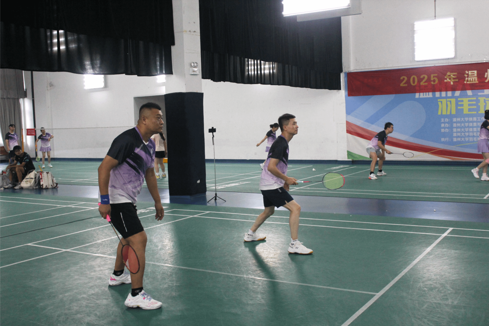 赛场上,参赛校友精神饱满、从容投入,均以享受运动、增进友谊的心态投身每一场对决。双打组合配合默契,发球沉稳精准,攻防转换间选手们步法灵活、衔接流畅,充分展现出良好的竞技状态。比赛过程中,大家始终秉持“友谊第一、比赛第二”的体育精神,既彰显了顽强拼搏的体育风采,更传递出同窗之间历久弥新的深厚情谊。观赛校友凝神关注赛事进程,不时为选手们的精彩表现送上掌声与喝彩。