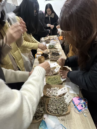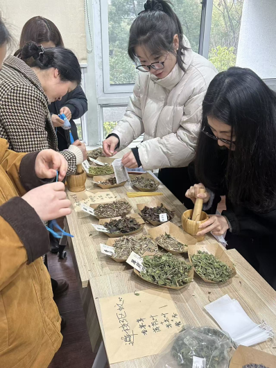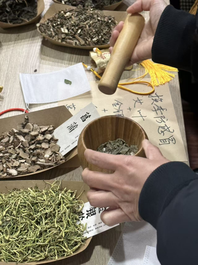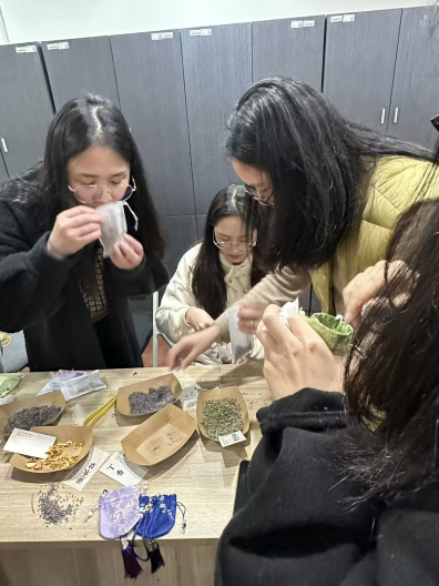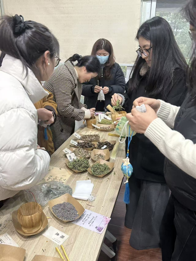 本次活动针对女性教师身心特点,特别准备了三种功能香囊:薰衣草为主的安神香囊,助益一夜好眠;艾叶薄荷调配的驱蚊香囊,守护夜晚安宁;丁香紫苏制成的防感冒香囊,寄托健康期许。包含不同中药成分的香料在捣碎器里飘出阵阵芳香,不仅诉说承载着中华传统女红技艺文化,更链接了新时代职场女性对美好生活的期许与创造。