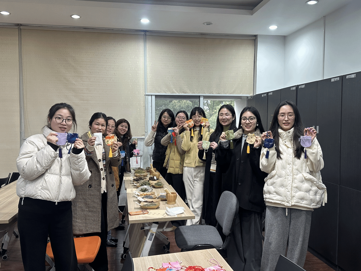 活动现场,艾草清香沁人心脾,各色香囊布料、丝线、流苏摆放整齐。学院女教师们化身巧手匠人,精心挑选不同味道的中药香料,搭配组合,将一份份心意、祝福与喜悦纳入囊中。“这样的活动真好。”参与活动的老师们纷纷表示,“在这个属于我们的节日里,亲手制作一枚香囊,既有意义,也是一种放松。”