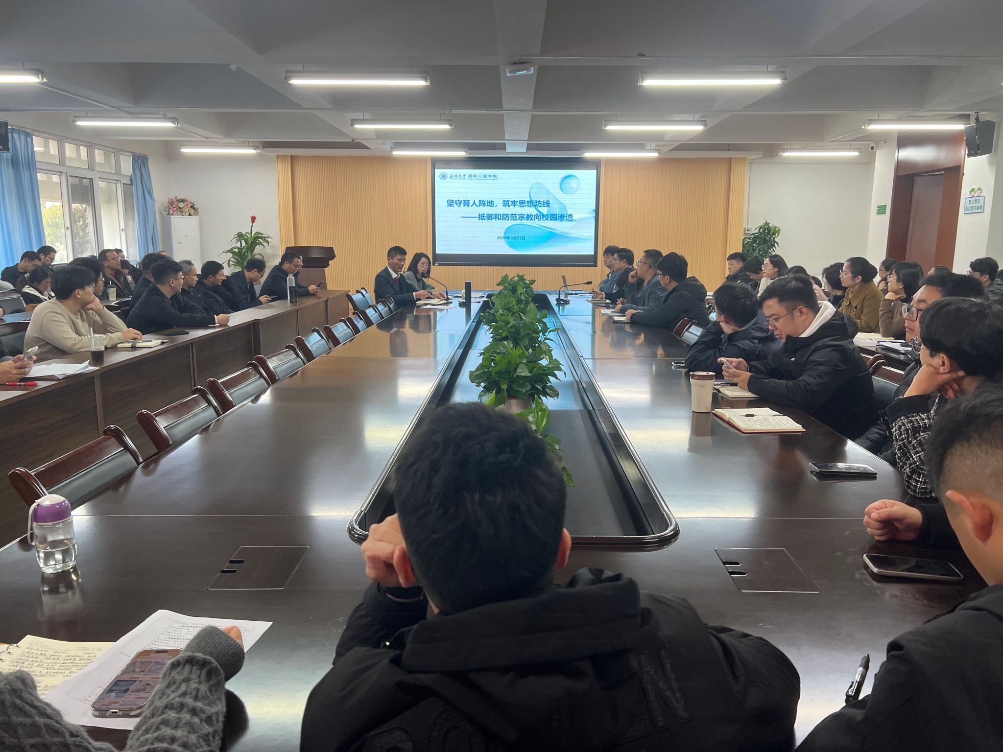 最后,学院开展了抵御和防范宗教向校园渗透专题学习。王壮书记强调,高校是意识形态工作的前沿阵地,必须筑牢校园意识形态安全防线。全体教职工要进一步提高政治站位,增强政治敏锐性和鉴别力,严格落实课堂教学、学术交流、学生活动等各环节的管理责任,确保校园始终成为坚持党的领导、弘扬科学精神、培育时代新人的坚强阵地;要加强对学生的思想引导和人文关怀,帮助学生树立正确的世界观、人生观、价值观,共同营造风清气正、健康向上的育人环境。