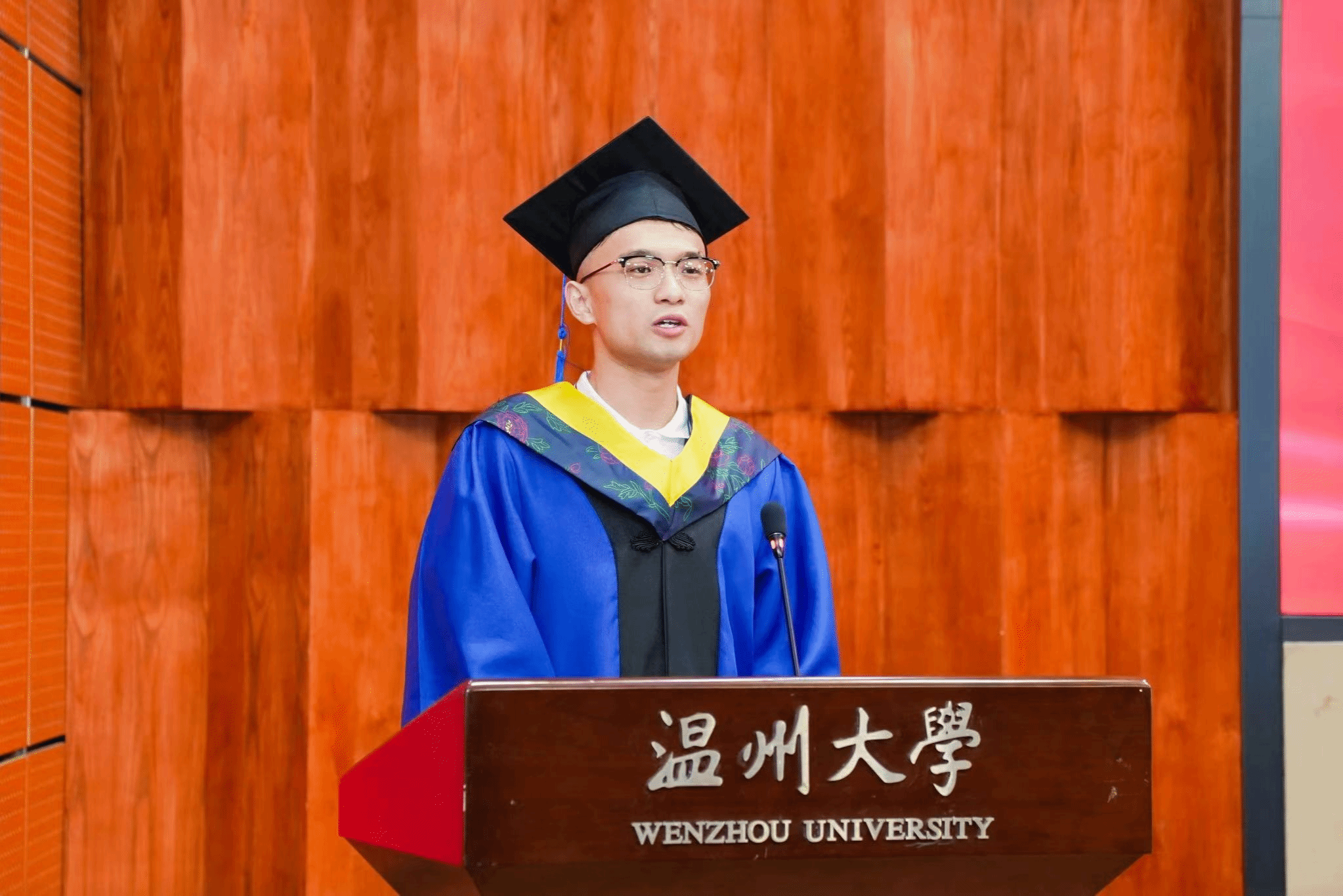 硕士毕业生代表应豪康饱含深情,回忆了大学生活的成长和收获,表示将牢记“学以致用,光大国族,造福人群”的价值取向,秉承“求学问是,敢为人先”的校训精神,行而不辍、砥砺前行。