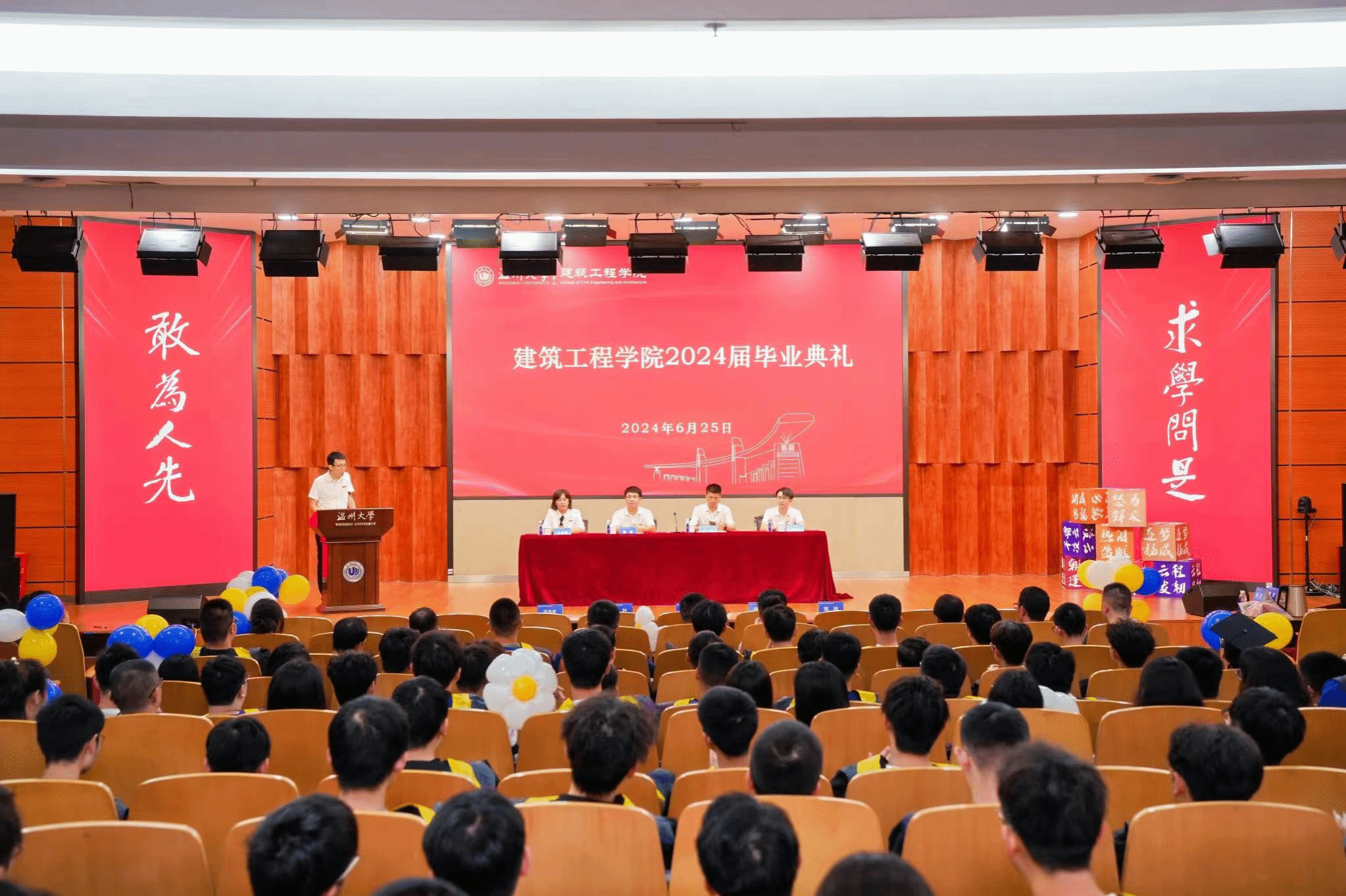 一曲骊歌忆山海,千帆竞发启新程。6月25日,建筑工程学院2024年毕业典礼暨学位授予仪式在雁山厅隆重举行。学院院长郭林、党委书记王壮、副院长吴冬雁、副院长符洪涛,专业负责人、科室负责人、教师代表、毕业生亲友等出席典礼。仪式由学院党委副书记陈铎主持。