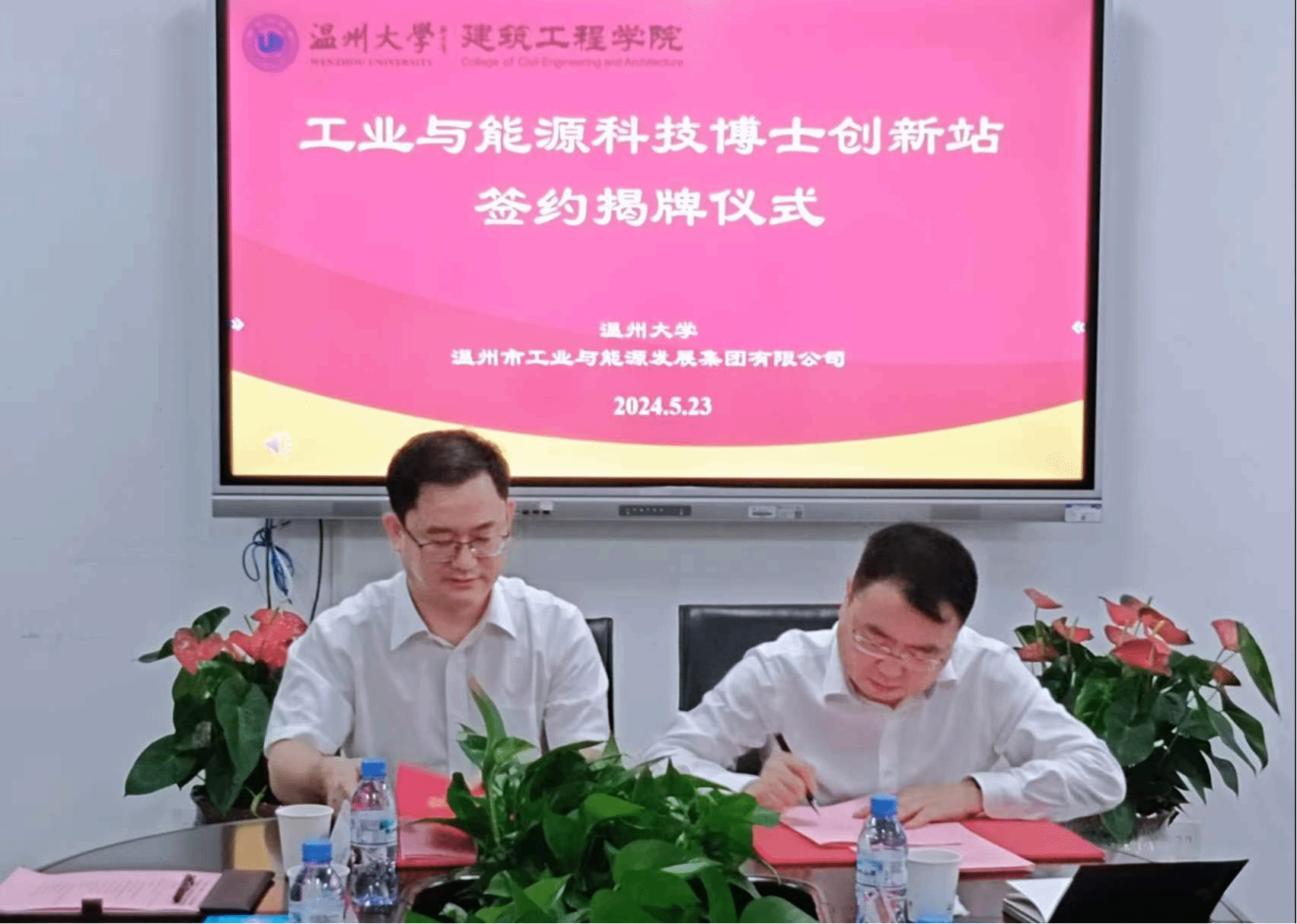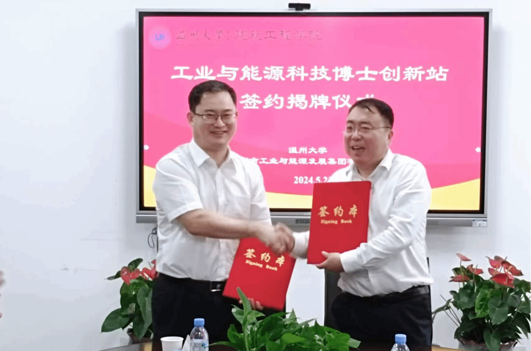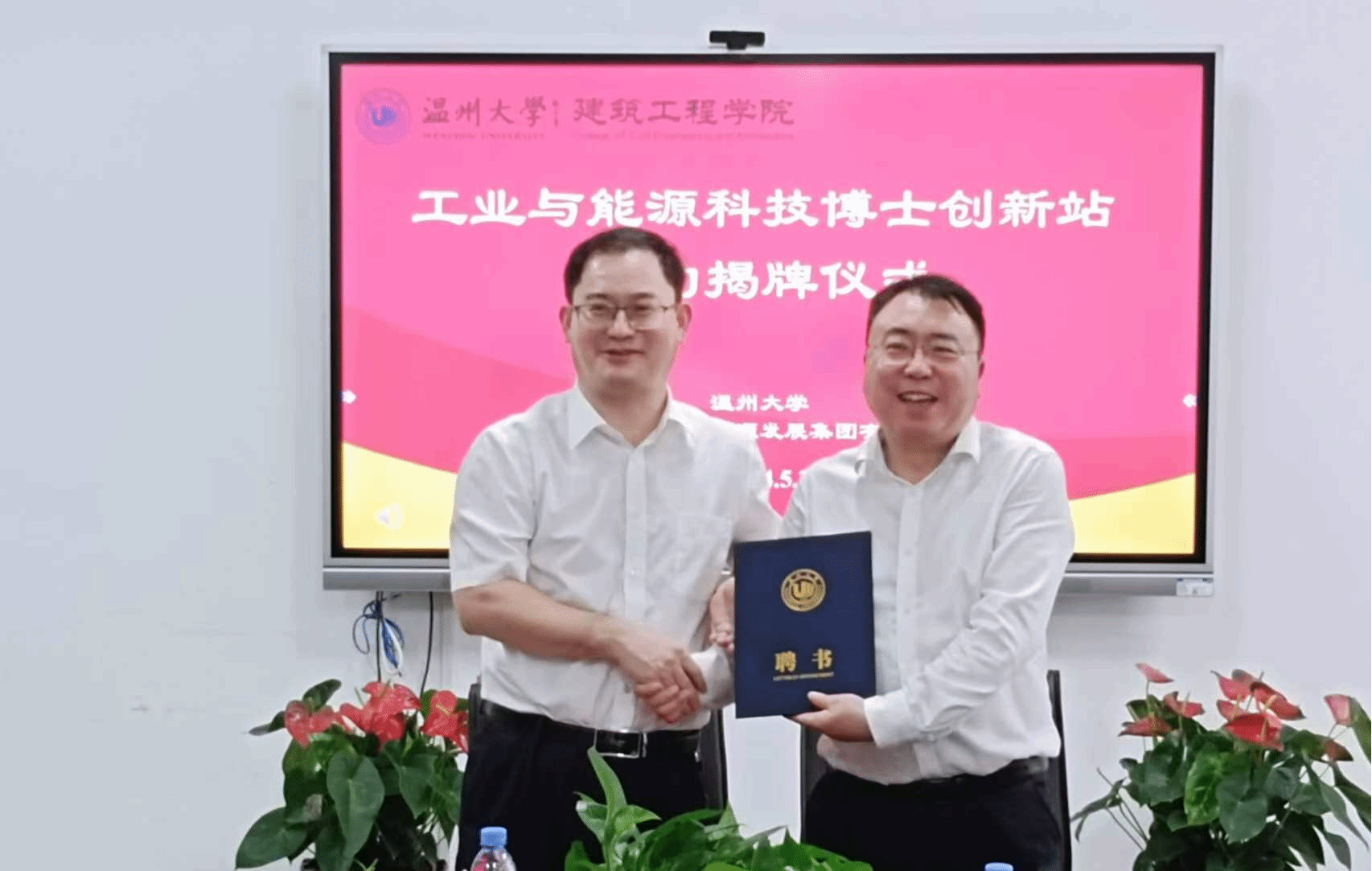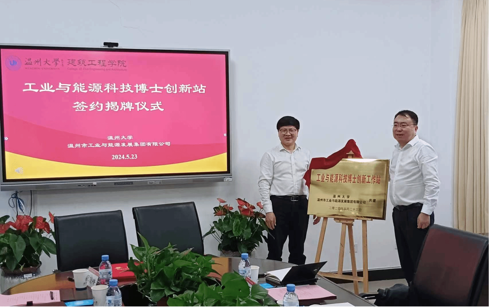 会上,温州大学建筑工程学院与温州市工业与能源发展集团签署成立工业与能源科技博士创新工作站战略合作协议并颁发证书,聘请朱祖荣董事长为博士创新站签约导师,合作指导挂职博士刘俊在工业与能源发展方面的相关研究工作。随后,参会双方领导进行了工业与能源科技博士创新工作站的揭牌仪式。