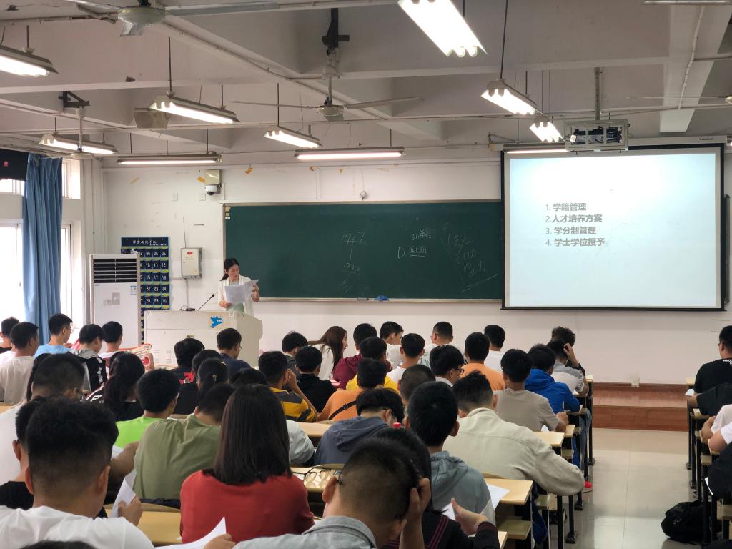 首先,建工学院学工办黄骐骥老师对新生入党条件与流程进行了详细的介绍。随后,教务科科长林彩芬老师对学籍管理、人才培养方案、学分制管理以及学士学位授予相关情况做了说明。最后,学工办主任潘莉莉老师对学生手册做了详细解读,对新生们的未来规划提了建议,并进行了防艾滋病、食品卫生、垃圾分类、劳动教育、保密法教育、疫情防控知识等相关知识教育。