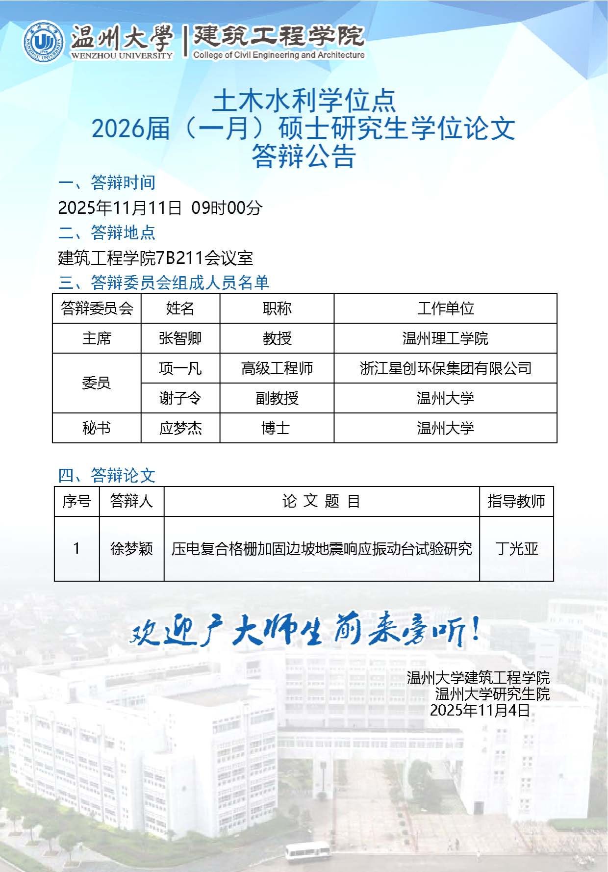 建筑工程学院2026届(一月)硕士研究生学位论文答辩公告