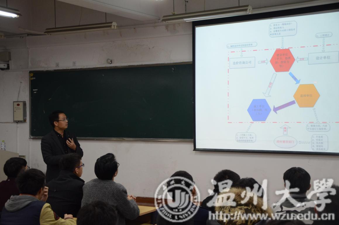 2016年11月29日晚18:30主题为土木工程专业就业形势和人才职业规划发展的第三期形势与政策课暨第十一期遇建微讲坛在建工楼7d202举行,讲座的目的是使建筑工程学院16级土木工程系新生中的与高年级的同学更快更好地熟悉本专业,了解本专业未来的发展。本次讲座的讲师为温州大学建筑工程学院教师孙富学老师,颜倩慧担任主持人。参与本次讲座的有土木工程16级全体新生以及部分报名本次讲座的大二大三的同学。